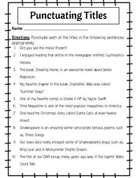 Teach your fifth grader how to punctuate titles of different written works in essays and reports with these exercises and hints. Five engaging activities, games, and worksheets to help students master correctly punctuating titles of works. Use quotation marks around the titles of short. Great for centers, homework, or.