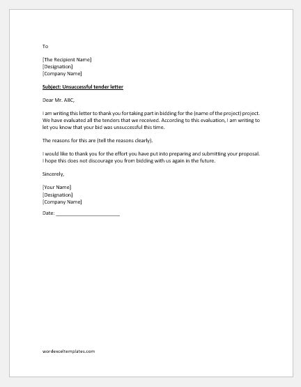 Bid Proposal Rejection Letter Samples (Writing Guide & Tips) from www.wordtemplatesonline.net